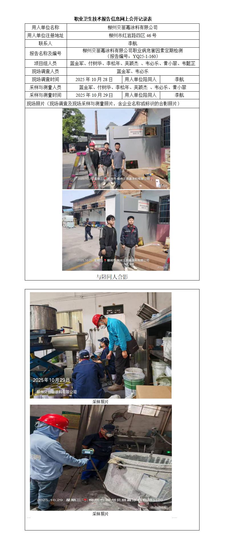 柳州貝麗嘉涂料有限公司職業(yè)病危害因素定期檢測 (報告編號:YQ25-1-160)