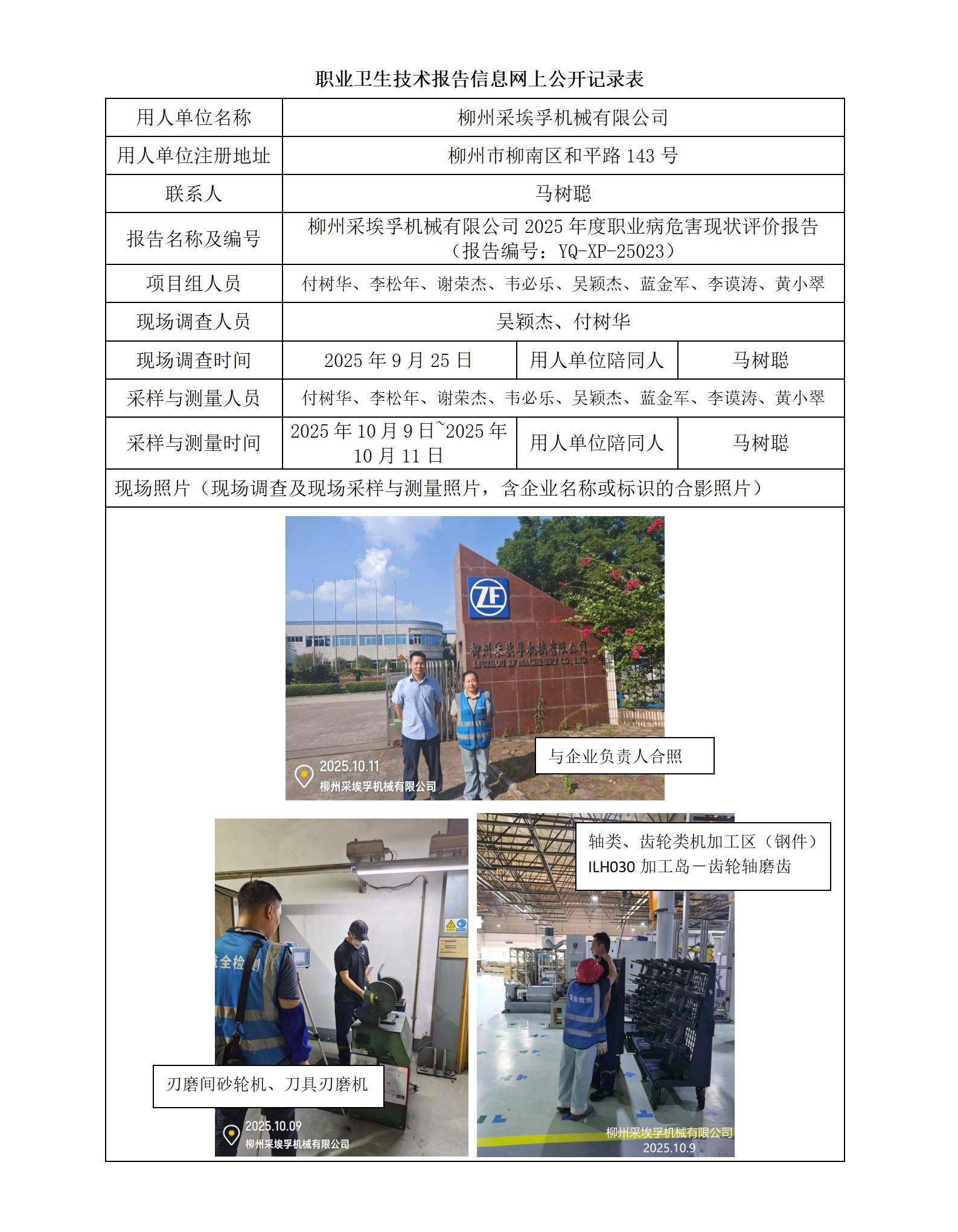 柳州采埃孚機械有限公司2025年度職業(yè)病危害現狀評價報告