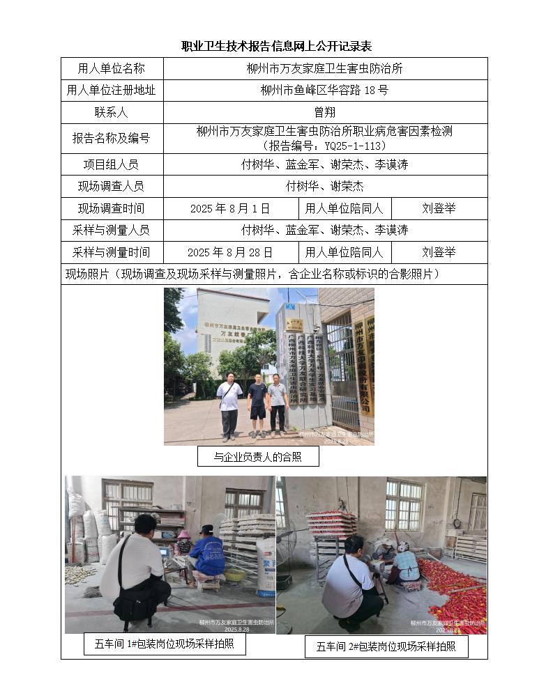 柳州市萬(wàn)友家庭衛(wèi)生害蟲防治所職業(yè)病危害因素檢測(cè) (報(bào)告編號(hào):YQ25-1-113)