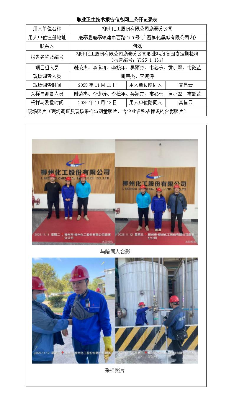 柳州化工股份有限公司鹿寨分公司職業(yè)病危害因素定期檢測 (報告編號:YQ25-1-166)