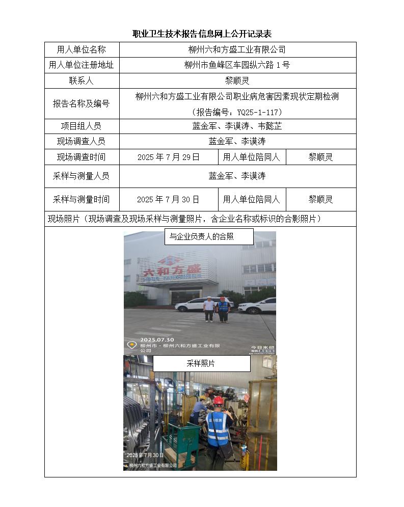 柳州六和方盛工業(yè)有限公司職業(yè)病危害因素現狀定期檢測 (報告編號:YQ25-1-117)